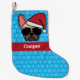 Ilustração moderna de um buldogue francês de cor clara vestindo um chapéu vermelho de Papai Noel e óculos de sol. O tema natalício frenchie é colocado sobre um fundo azul com um padrão branco de floco de neve e tem espaço para acrescentar sua própria redação. Estão também disponíveis diferentes versões coloridas do buldogue francês.