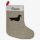 O impressão bonito do tecido assemelha-se ao linho ou à serapilheira com um espaço para adicionar seu nome ou nome do seu cão do wiener. Uma meia clássica do Natal do estilo country com uma silhueta de cabelos compridos do Dachshund. Todos quer ser uma parte das festividades sazonais e nossos amigos do weenie não são nenhuma exceção. Encha com os brinquedos e os deleites para seu membro da família de quatro patas. Decoração do feriado do amante festivo de Doxie para a casa ou o escritório. Esta meia do Xmas de Dachsie está disponível em muito mais raças do cão pelo mundo do Doodle de Jenn.