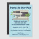 meio século moderno convite de festas de aquecimento doméstico. A casa é do tipo visto no sul da Califórnia com texto dizendo "Party At Our Pad" e "Calling all legal cats" para aquela vibração da gíria do meio século.