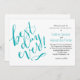 Estes convites para o casamento divertidos apresentam o texto teal da tipografia que diz "MELHOR DIA DE TODOS!" Use o botão PERSONALIZAR TI acima para adicionar texto. Adequado para casamentos, aniversários ou outros eventos especiais. Esta coleção vem em 6 cores modernas e tem muitos produtos correspondentes disponíveis: koozies de cerveja, adesivos, guardanapos, placas de papel, camisetas e muito mais! Se você quiser que este item seja de outra cor ou estilo, eu projetarei qualquer produto para atender às suas necessidades específicas. Para perguntas ou outros itens com este design, entre em contato comigo: cheryl@cheryldanielsart.com. design de "Fleur de Lyrica" por Cheryl Daniels © 2015.