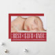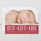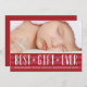 Um cartão com fotos de Natal bonito para o primeiro Natal do bebê. Este novo anúncio vermelho e cor-de-rosa de nascimento de bebês apresenta a frase "Melhor presente de sempre" e inclui espaço para uma foto.