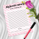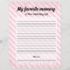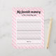 Crie memórias permanentes com a memória favorita da garota de aniversário! Apresentando um charmoso design com listras cor-de-rosa e sotaques reluzentes, esta folha de memória permite aos convidados anotar suas memórias favoritas da aniversariante. É um toque sincero e pessoal que adiciona calor e amor a qualquer celebração. Perfeito para aniversários, chás, e muito mais, essas folhas podem ser coletadas e apreciadas como guardiã. Encoraje seus convidados a compartilhar seus momentos especiais e tornar a celebração de aniversário ainda mais memorável!