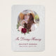 Belo cartão de memória floral vermelho e rosa/cartão de oração funerária com uma foto enfeitada com rosas vermelho e rosa-d'água e flores do hálito do bebê contra um plano de fundo prateado.