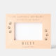 Elegante quadro fotográfico de madeira gravada a laser para homenagear a memória do seu cão com impressões de pata, as inscrições "In Loving Memory" e "Forever in Our Hearts" na tipografia serif clássica, e o seu nome e o seu sentimento pessoal.