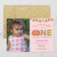 Rapariga Caiu no Convite de Aniversário de Abóbora com foto personalizada. Convite de aniversário de queda. Gliiter Dourado. Rosa, Laranja e Dourado. 1rua, Primeiro Convite. Para mais personalização, clique no botão "Personalizar" e use nossa ferramenta de design para modificar este modelo.