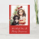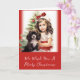 Uma menina tão doce segurando seu cachorrinho de panela perto da árvore de Natal. Ela está adoravelmente vestida de branco de férias com arcos e cinzas vermelhos adoráveis. Você não precisa amar cachorros para gostar deste cartão, mas você pode! O conceito teve origem em uma design de cor d'água. "Desejamos Um Feliz Natal" é o sentimento clássico. Observe que a foto na frente desta placa dobrada e a redonda emoldurada no dentro são substituíveis ou ambas com sua própria fotografia, se você escolher. Além disso, todo o texto, que está branco à frente (sobre fundo vermelho) e um dentro vermelho excelente, pode ser editado com a sua própria redação. Certifique-se de alterar os nomes de exemplo e a data.