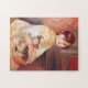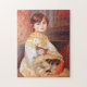 Menina de Renoir com quebra-cabeça do gato. Pintura a óleo em canvas desde 1887. Esta pintura bonita foi terminada durante o rejecection de Pierre-Auguste Renoir do impressionismo. A criança com gato caracteriza uma rapariga bonito com o cabelo marrom que guardara um gato da concha de tartaruga do sono em seu regaço. A menina veste um vestido branco com bordado do ouro e tem os olhos azuis macios. Um presente bonito para fãs de Renoir, de pinturas do gato, e do art. francês.
