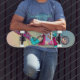 Uma menina bonito do estilo do anime com uma bandeja de biscoitos em um skate.