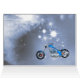 Uma moça loira ao longo de uma moto de helicóptero com estrelas e nuvens ao fundo. Um cartão de aniversário de excelente para um entusiasta de moto.