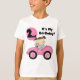 Uma menina com um balão cor-de-rosa em um convertible cor-de-rosa na menina em t-shirt do segundo aniversário do carro, em cartões, em etiquetas, em ímãs, em umas sacolas, em botões do segundo aniversário, e em mais cor-de-rosa.