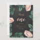 Um design de aquarela em florais cor-de-rosa pastel e quadro negro. Decoração chique, festas boêmicas boho, roteiro elegante. Rapariga Flores de Aquarela Primeiro Convite de Aniversário. Um, 1, primeiro aniversário. Flores cor-de-rosa em fundo de quadro.