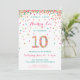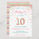 Celebre o aniversário de 10 anos com ouro colorido, cor-de-rosa, hortelã e macarrão nos convites de 10 anos! Apresentando os detalhes da festa da sua filha e um "10" em confetti. O título diz: "HOORAY, AMEN!" Listras coloridas e bonitas na parte de trás. Este design adorável é super fofo e giro.