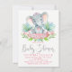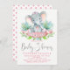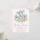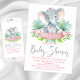 Meninas elefantes convidam para um chuveiro de bebês com adorável bebê elefante vestindo um arco rosa giro em um fundo de folha de palma. Esses convites para chuveiros de bebês elefantes são facilmente personalizados para seu evento simplesmente adicionando seus detalhes de evento.