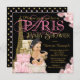Convites de chá de bebê em Paris com uma bela Torre Eiffel de ouro, pacotes elegantes de presentes em Paris, doce menina vestindo uma roupa rosa e preta fofa e bereta e cordas de pérolas com um roteiro de Paris cor-de-rosa rico num fundo floral rosa e rico. Este belo convite para o chá de fraldas de Paris é facilmente personalizado para o seu evento, simplesmente adicionando os seus detalhes no estilo de letra e cor, e a redação da sua escolha.