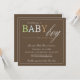 Este convite apresenta as palavras "menino" em cores pastéis bonito contra um fundo marrom. Os detalhes do Chá de fraldas estão abaixo.