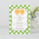 Um convite do chá de fraldas do pintinho dos gêmeos da páscoa do doce que caracteriza um par bonito de pintinhos gêmeos do bebê ajustou-se em um fundo verde e branco das bolinhas. Disponível para meninas, meninos & gêmeos em nossa loja. Produtos de harmonização também disponíveis em nossa loja em www.celebrateitinvites.com. ©Zenware