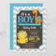 É um menino! Convite para chá de fraldas de dinossauro de bebê azul, laranja e amarelo. Cinza e fundo do padrão de fevron branco.
