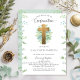 Convite de Confirmação Elegante com uma cruz de ouro refinada rodeada por folhas de cor d'água pintadas manualmente em tons verdes claros e azuis de menta. Detalhes da tipografia de scripts escritos à mão moderna. Belo cartão está de volta em tom verde pálido com folhas decorativas nos lados e buquê foliar central maravilhoso com o nome de sua filha/filho. A cor da placa traseira pode ser alterada selecionando personalizar. Convite com seção para detalhes de "Cerimônia" e "Recepção". Excelente ao estilo Unisex para raparigas e rapazes. Design com variedade de bananas, palma, folhas de samambaia. Parte da nossa Parte da "Unisex Elegant Greenery Religius Event Collection" com uma variedade de produtos coordenadores.