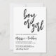 É hora de deixar o segredo fora da bolsa e fazer seu anúncio especial, garoto ou garota? Nosso convite de chá de fraldas é perfeito para a ocasião! Este design polido apresenta uma paleta preta e branca, criando uma aparência de eterno. Dê suas notícias especiais com estilo e convide seus amigos e família para comemorar o grande dia!