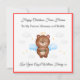 Este cartão de lembrança de Natal é adequado para os pais ou avós de um bebê no céu. A design inclui um contorno vermelho, nuvens, estrelas douradas e um urso de anjo aquoso com bálamo de Natal.