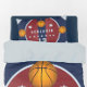 Um presente personalizado e único para o seu bravo com o menino de basquetebol ou filho adolescente ou neto, sobrinho, afilhado etc... Um cobrir personalizado de duvet com uma quadra de basquete, bolas de basquete e estrelas que você pode personalizar com o nome da sua própria super estrela, assim como o número da sua camiseta. Esquema de cor vermelho, branco e azul. Excelente aniversário ou presente de Natal para um rapaz, adolescente ou adolescente. * Mockup por Alexander Cho para Freepik.