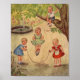 Ilustração antiga de crianças em brincadeira num jardim pitoresco com plantas maduras e árvores e um lago de peixe com fonte. É de um livro infantil antigo