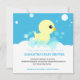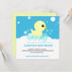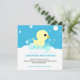 Chá de fraldas de borracha branca para rapazes com um pato de borracha amarelo e um fundo azul e branco. O verso do convite é amarelo com pontos azuis. Personalize com seus detalhes de chá usando nosso modelo fácil.