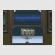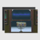 Uma representação de uma menorah tradicional Chanukkah numa janela. A menorah está refletida na janela, há geada no vidro, e neve lá fora.