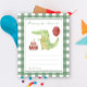 Festa de aniversário de criança de Aquarela. Crocodilo de Aquarela ou Alligador, bolo com velas, balão vermelho. Fundo de gaiola verde.