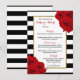 A coleção de luxo moderna de chic apresenta um histórico clássico de listras brancas e pretas, acentuado com belas rosas vermelhas de rubi e uma falso estrutura de folha de ouro. Esses cartões de menu são fáceis de personalizar e serão o acessório perfeito para qualquer casamento, chá de panela, festa de aniversário, celebração de noivados ou qualquer outra ocasião especial.