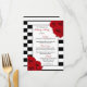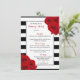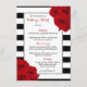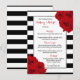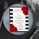 A coleção de luxo moderna de chic apresenta um histórico clássico de listras brancas e pretas, acentuado com belas rosas vermelhas de rubi e uma falso moldura de folha de prata. Esses cartões de menu são fáceis de personalizar e serão o acessório perfeito para qualquer casamento, chá de panela, festa de aniversário, celebração de noivados ou qualquer outra ocasião especial.