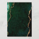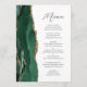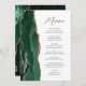 This elegant modern wedding menu features an emerald green watercolor agate border trimmed with faux gold glitter. The customizable text combines charcoal gray handwriting script and sans serif fonts on a white background. The green and gold agate design is repeated on the reverse side.