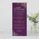Este belo menu irá adicionar algum estilo à sua recepção de casamento. Apresenta um belo design com ornamentados de folha falsa e espirais num fundo cor de roxo ou beringela profundo. Há espaço para os nomes do casal e da data do casamento, e o texto é totalmente personalizável. Classy, na moda e glam, este menu adicionará um talento de rico à sua recepção de casamento.
