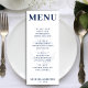 Menu de recepção de casamento azul e branco náutico. Excelente para um Marinho (militar) ou casamento em casa de lago. Design apresenta uma âncora embutida em uma faixa com texto "Ancorado no amor". Personalize-o com seus detalhes de casamento.
