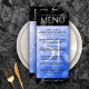 Adicione sofisticação às comemorações de aniversário de casamento da safira de 511 ruas com este menu de janto, que contém uma elegante letra e um confete hexagonal em fundo azul e preto de safira. Personalize com nomes de casal, datas de casamento, detalhes do local, itens de menu e mensagens de parabéns. Design © W.H. Sim. Mais informações em zazzle.com/expressionsoccasions