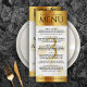 Adicione sofisticação às comemorações do 3° aniversário de couro com este menu de janto, que contém uma elegante inscrição com um confete hexagonal dourado sobre um fundo de couro branco luxuoso coberto por uma folha de ouro. Personalize com nomes de casal, datas de casamento, detalhes do local, itens de menu e mensagens de parabéns. Design © W.H. Sim. Mais informações em zazzle.com/expressionsoccasions