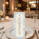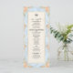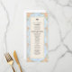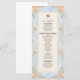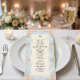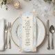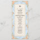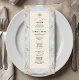 Transporte seus convidados para uma era romântica com este design inspirado no Rococó, apresentando flores em aquarela e querubins. Perfeito para uma recepção de um jardim de conto de fadas. Este design apresenta uma composição exuberante e romântica centrada em um fundo azul claro suave que simula uma textura de mármore impresso. As bordas são adornadas com uma moldura ornamentada de filigrana dourada falsa em estilo barroco, entrelaçada com ilustrações em aquarela de rosas cor de pêssego, margaridas creme e samambaias verde-sage. No topo, querubins caprichosos são retratados tocando violinos, ladeando uma ilustração clássica de uma campânula de servir. O texto é organizado em uma hierarquia tradicional usando tipografia serifada elegante em carvão e um cabeçalho em caligrafia manuscrit
