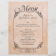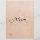 Menus gastos da mesa da recepção de casamento do vintage feitos em um olhar antigo do pergaminho, com gráficos de um trabalho decorativo preto da área e do rolo de texto do quadro na parte inferior. O menu no texto gráfico do roteiro do rico do preto decora a parte superior do menu. Todo o texto dentro da área moldada está pronto para personalizar para sua recepção de casamento.