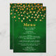 Este cardápio de casamento rústico e cheio mostra folhas de ouro em um fundo verde angustiado. O texto combina fontes itálicas e serif para uma aparência moderna e na moda. Isso será perfeito para os casamentos outono do outono.