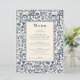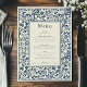 Elevem sua recepção de casamento com este elegante menu botânico, projetado para complementar uma celebração clássica e eterno. A sofisticada borda floral em quadros azuis profundos o texto central, oferecendo uma apresentação graciosa e refinada para seus convidados. Com um design de fundo inspirado na pintura creme, traz um toque de encanto do mundo antigo para sua celebração moderna. Perfeito para adicionar uma camada extra de beleza à sua configuração de mesa, este menu orienta os seus convidados através dos cursos deliciosos planejados para o seu grande dia. Ideal para casais que procuram uma elegante estética tradicional para o seu casamento.