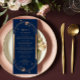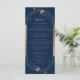Místico Azul Dourado Sol Lua Estrelas Espaciais Cartões de Menu de Casamento Apresenta um raio sol dourado, lua e estrelas sobre um fundo azul com os seus detalhes cardápios no centro em um moderno roteiro de caligrafia dourada. Personalize editando o texto nas caixas de texto fornecidas. Projetado para você pelo Evco Studio © em www.zazzle.com/store/evcostudio