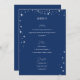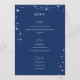 Convide seus convidados para uma noite de romance e luz estelar com este elestial cardápio azul-marinho de casamento simples da Coleção Celestial Elegante de Casamentos. Com um fundo azul marinho profundo adornado com estrelas cintilantes e refinada tipografia, esse design celeste moderno é perfeito para casais que amam uma estética minimalista, mas luxuosa. Personalize facilmente com seus nomes, data de casamento e detalhes de local para um toque totalmente personalizado. Ideal para casamentos celestes, comemorações de inverno ou recepções elegantes à noite. Compare-o com cartões RSVP, programas, menus e sinalização para uma suíte de casamento coesa.