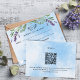 Um céu branco e azul de verão como fundo, texto negro. Decorado com flores de lavanda e verde de eucalipto. Personalize e adicione uma resposta por data. Adicione as seleções/opções do menu. Voltar: adicione o URL do seu site de casamento ao código QR para obter mais detalhes e/ou RSVP