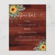 Por favor, note que este menu está no papel folheto e muito fino. Os envelopes não estão incluídos. Para menus mais espessos (mesmo design) visite nossa loja. Madeira marrom rustica como fundo. Decorado com girassóis de cor aquosa e eucalipto verde. Com o texto: Abrir bar. Personalize e adicione o menu bar.