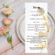 Cartão de menu batismo. Personalize e adicione um nome, data e menu. Fundo branco, texto preto. Decorado com um sistema de eucalipto de grande ouro. Voltar: fundo do ouro.