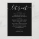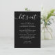 This black wedding menu card features a modern, minimalist design with a clean layout and a relaxed script heading. The “let’s eat” title adds a warm, informal touch, making it a great fit for couples who want their reception to feel stylish but not overly formal. The simple structure keeps each course easy to read, while the contrast between the script and classic text creates a balanced, contemporary look. It works beautifully for seated dinners, casual receptions, and modern wedding setups. A great choice for minimalist, contemporary, and relaxed wedding styles, especially for couples who prefer a clean design with a friendly, approachable feel.