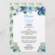 This beautiful and elegant wedding menu features watercolor baby blue and navy blue flowers with foliage. The text combines handwritten script and serif fonts for a stylish and modern look. This is perfect for a spring or summer rustic wedding.
