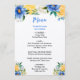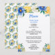 This beautiful and elegant wedding menu features watercolor blue, yellow and white flowers with foliage. The text combines handwritten script and serif fonts for a stylish and modern look. This is perfect for a spring or summer rustic wedding.