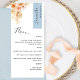 Porquê gastar cartões de lugar e cartões de menu quando pode ter um Menu elegante All-in-one personalizado com cada nome de convidado! Design contemporâneo, simples e elegante com detalhes florais de cor d'água refinados numa bela mistura de pêssego, laranja, escamudo, coral empoeirado, creme e tons de champanhe. Elementos modernos de caligrafia escrita à mão. Pressione no canto superior direito em tom azul com o nome de convidado em preto. De volta ao mesmo azul que a listra. Capacidade de alterar ambas as cores de distribuição ou vice-versa selecionando "personalizar mais". NOTA: adicione um nome de convidado a cada menu, adicione um menu no carrinho de compro; depois volte ao menu, adicione o segundo nome de convidado e adicione o menu para comprar o carrinho...continue com este processo com todos os nomes de convidados na sua lista. Zazzle não recebe listas de nomes de convidados para o impressão. Para primeiros nomes de convidado curtos, adicione com sua barra de espaço do teclado alguns "espaços" vazios antes do nome ao centro. Design disponível em uma variedade de opções de cores. Parte da nossa coleção "Peach Floral Delight in Blue" com uma variedade de produtos de coordenação disponíveis. Visite a coleção inteira em: https://www.zazzle.com/collections/peach_floral_delight_with_blue-119436951689312574
