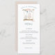 Estilo russo para as suas mesas de café da manhã de casamento. Uma ilustração de um bolo de casamento e de uma vela sobre um balanço de madeira decorado com flores cor-de-rosa e folhas de eucalipto azuis está no topo com seus nomes curvos acima. A tipografia é simplista e na moda e é facilmente personalizada para seus próprios detalhes. Você também pode alterar o estilo e as cores da fonte e as cores de fundo na frente e na parte traseira, se desejar, por meio da opção Clique para Personalizar mais.